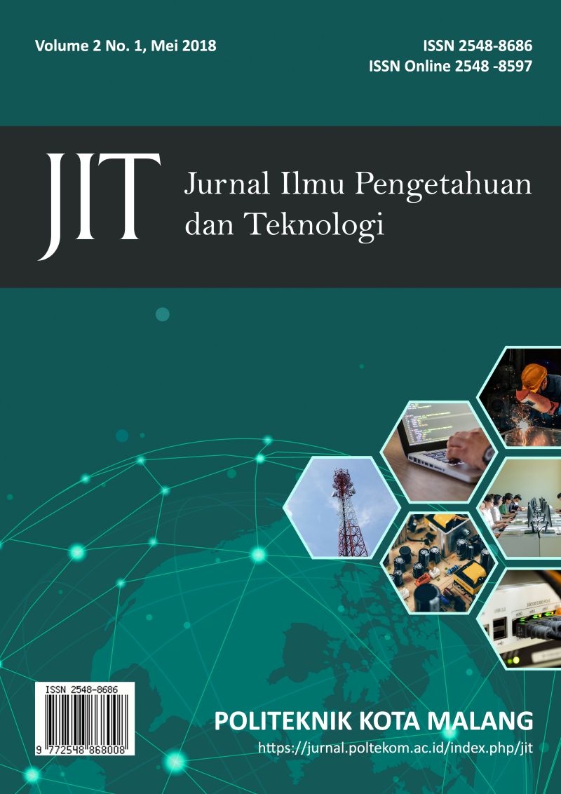 Vol. 2 No. 1 (2018)JIT (Jurnal Ilmu Pengetahuan dan Teknologi) ditujukan sebagai sarana bagi para peneliti, akademisi, dan praktisi untuk mempublikasikan hasil atau temuan penelitian, konsep, dan gagasan terkini mengenai Pengembangan Ilmu Pengetahuan dan Teknologi Informasi.